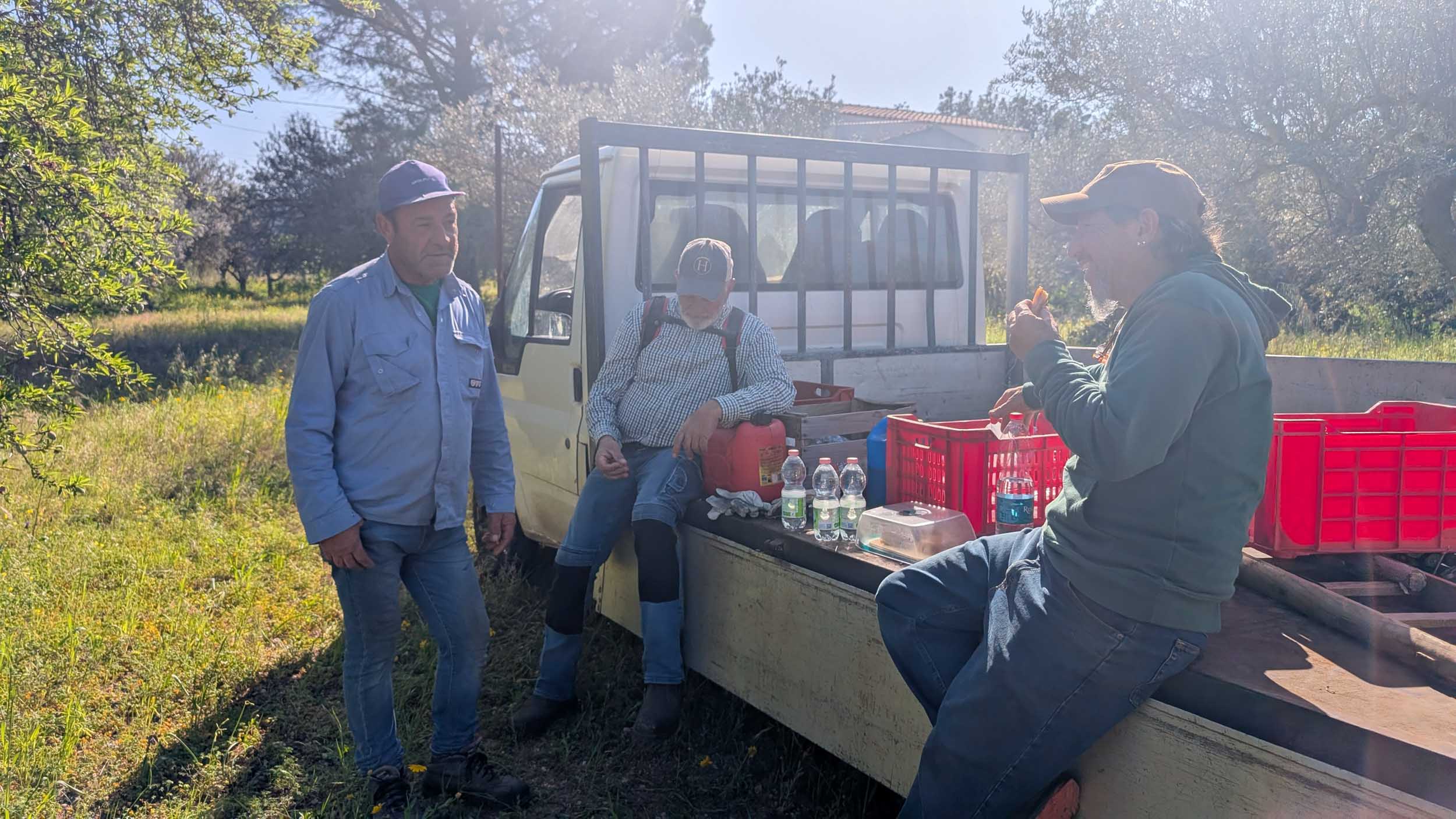 I’ve already discussed the pruning, but that’s just the first steps. Next comes tilling the fields around the trees and then cleaning close to the trees themselves. This involves removing the wild olives that grow and multiply, entangled in the roots of the tree and on the trunk itself, much like barnacles on a whale. While a year ago, Danny liked those wild olives and wanted to find a way to make table olives from them, now, with our olive farmer glasses, we approach them like the enemy, eradicating them from more than forty trees just as the Mediterranean sun began to warm the soil. After wrapping up that task, it was on to weeding around the 300 new trees, by hand, so as not to damage their tender youth.